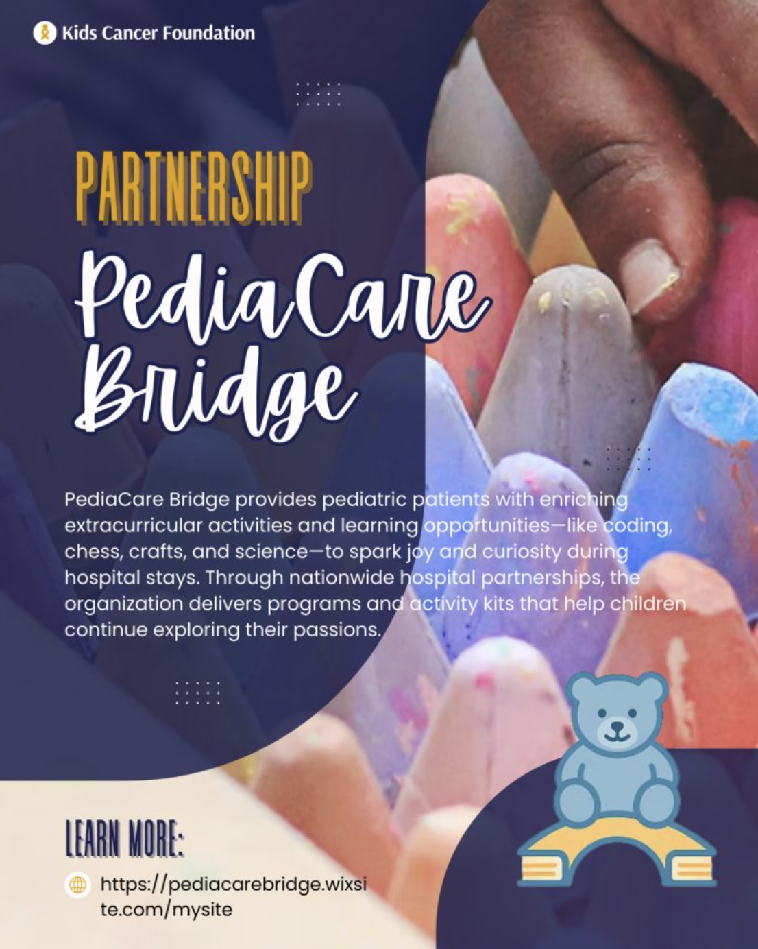 The Kids Cancer Foundation is excited to reveal our new partnership with 💛 PediaCare Bridge 💛. This collaboration brings forth amazing opportunities for pediatric patients. Together, we aim to deliver engaging activity kits and develop empowering hospital programs that will reach families across the nation.